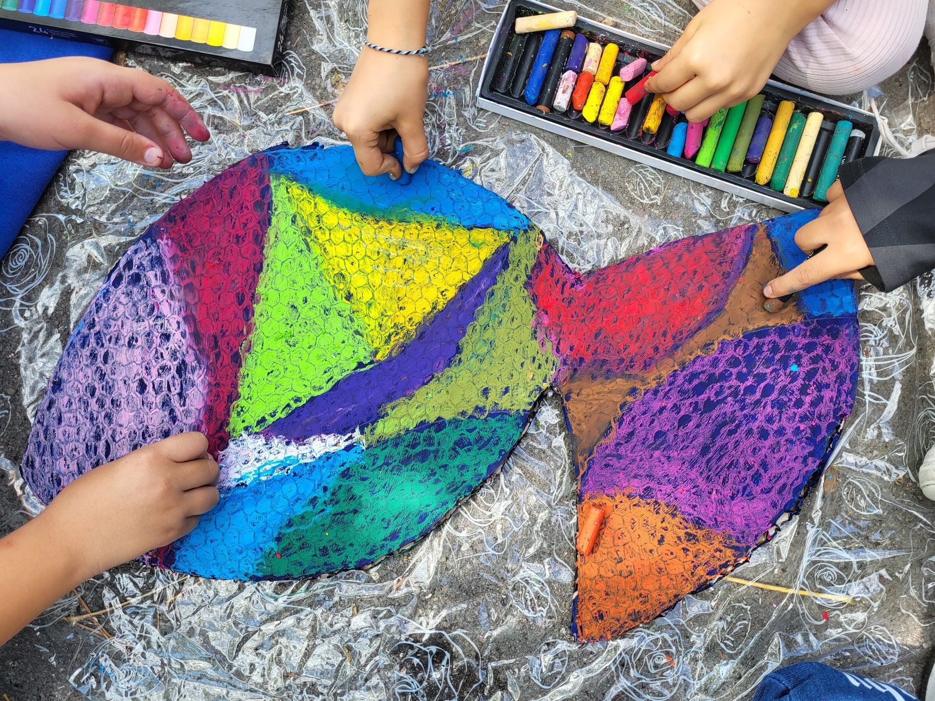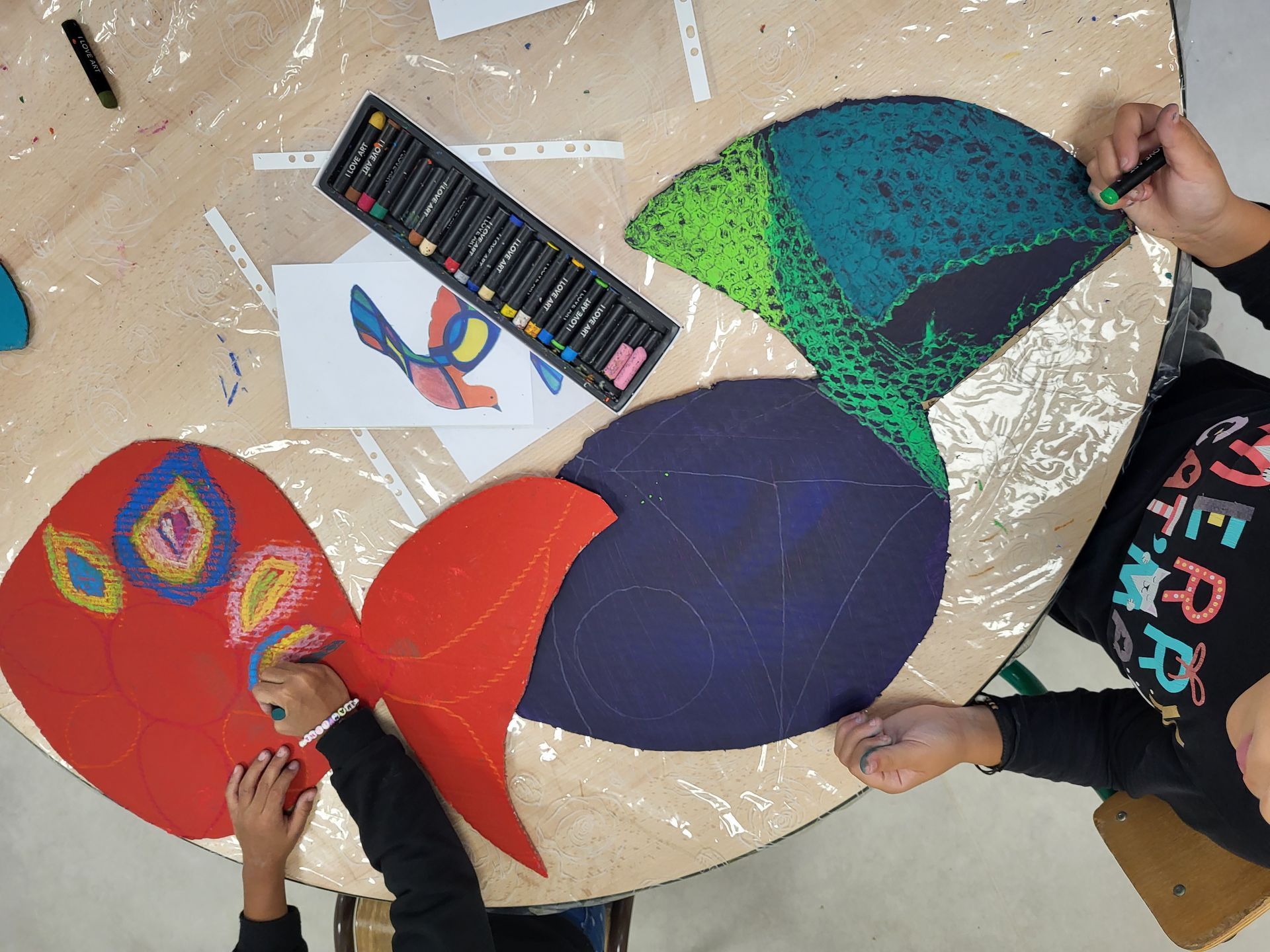 Je propose aux participants des grands motifs que j'ai dessinés et découpés dans du carton peint à l'acrylique et des pastels gras d'une vingtaine de couleurs. Les enfants se regroupent par deux ou trois pour multiplier leur créativité.