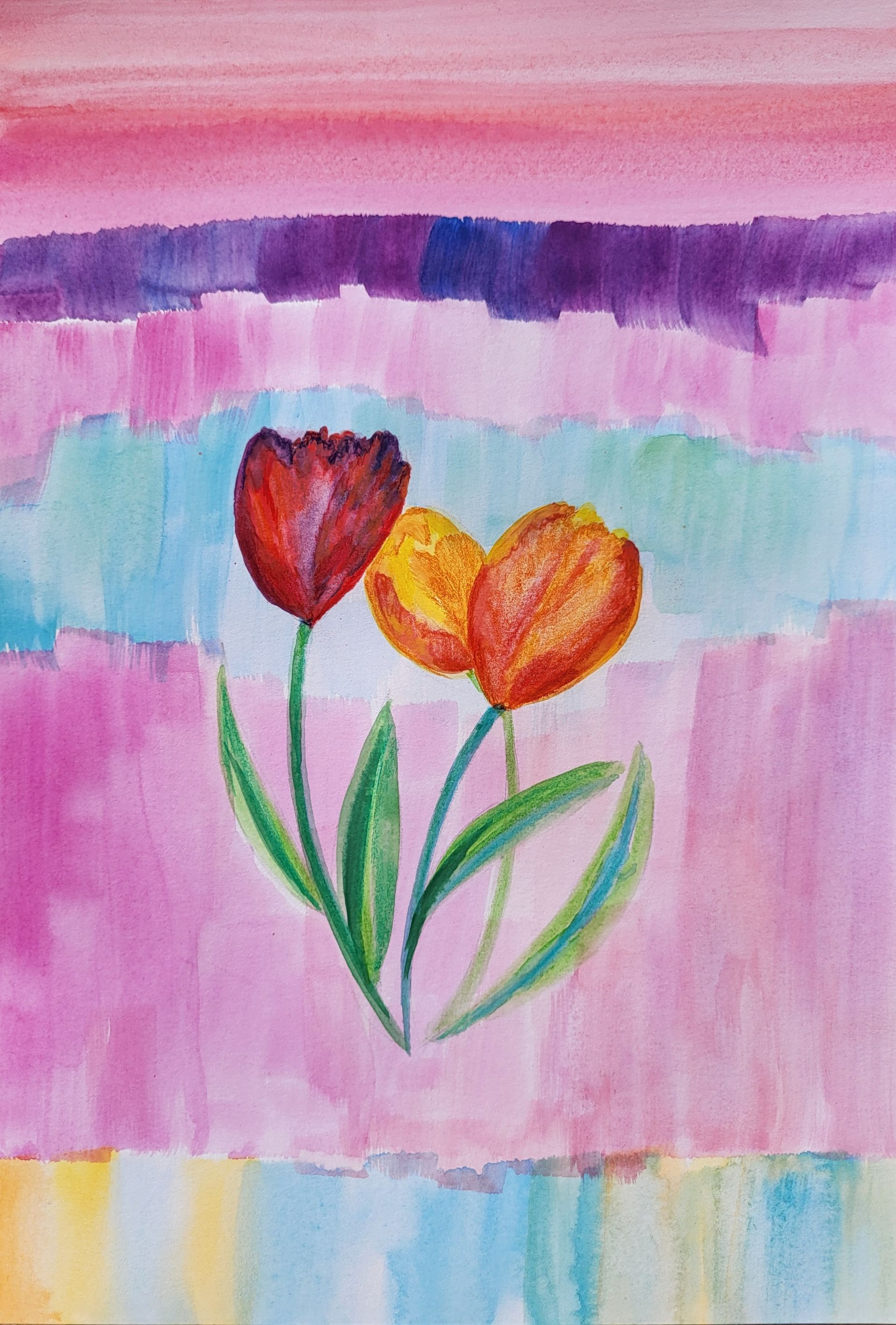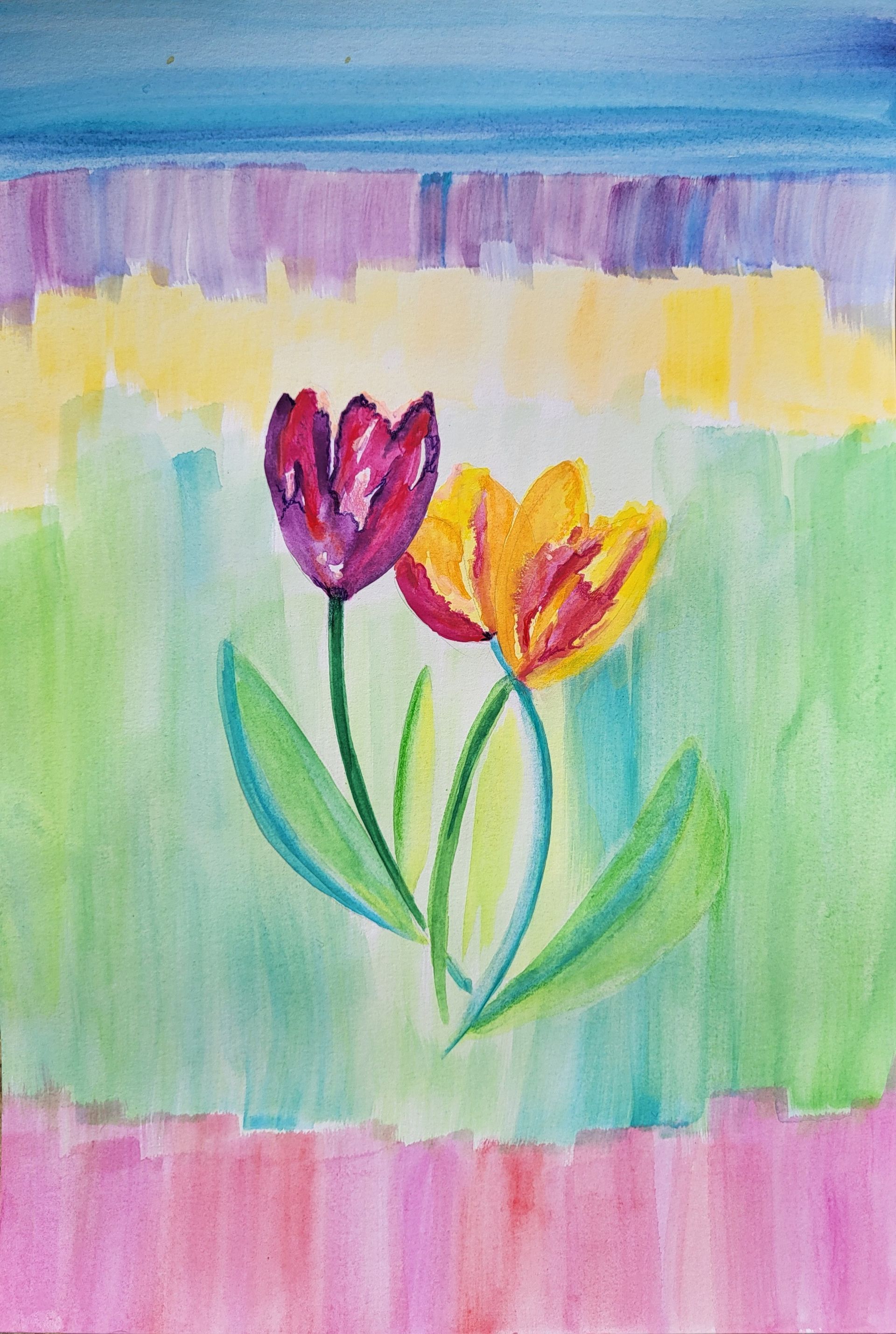 Dessiner les pétales des tulipes, leurs tiges et leurs feuilles dans une composition faite de courbes, puis peindre à la gouache un fond multicolore en camaïeu, en contraste et en transparence, à grands traits horizontaux et verticaux...