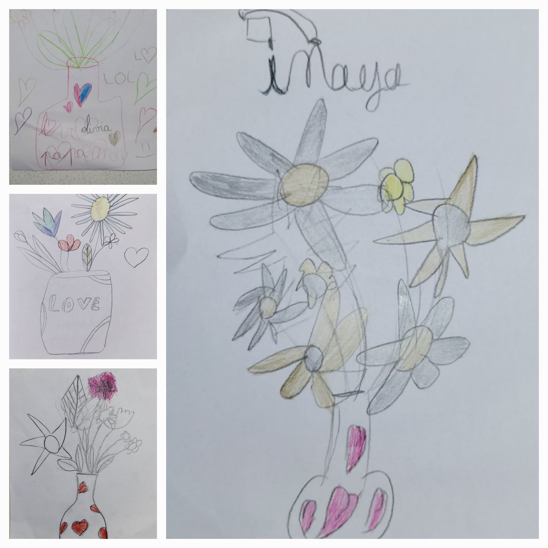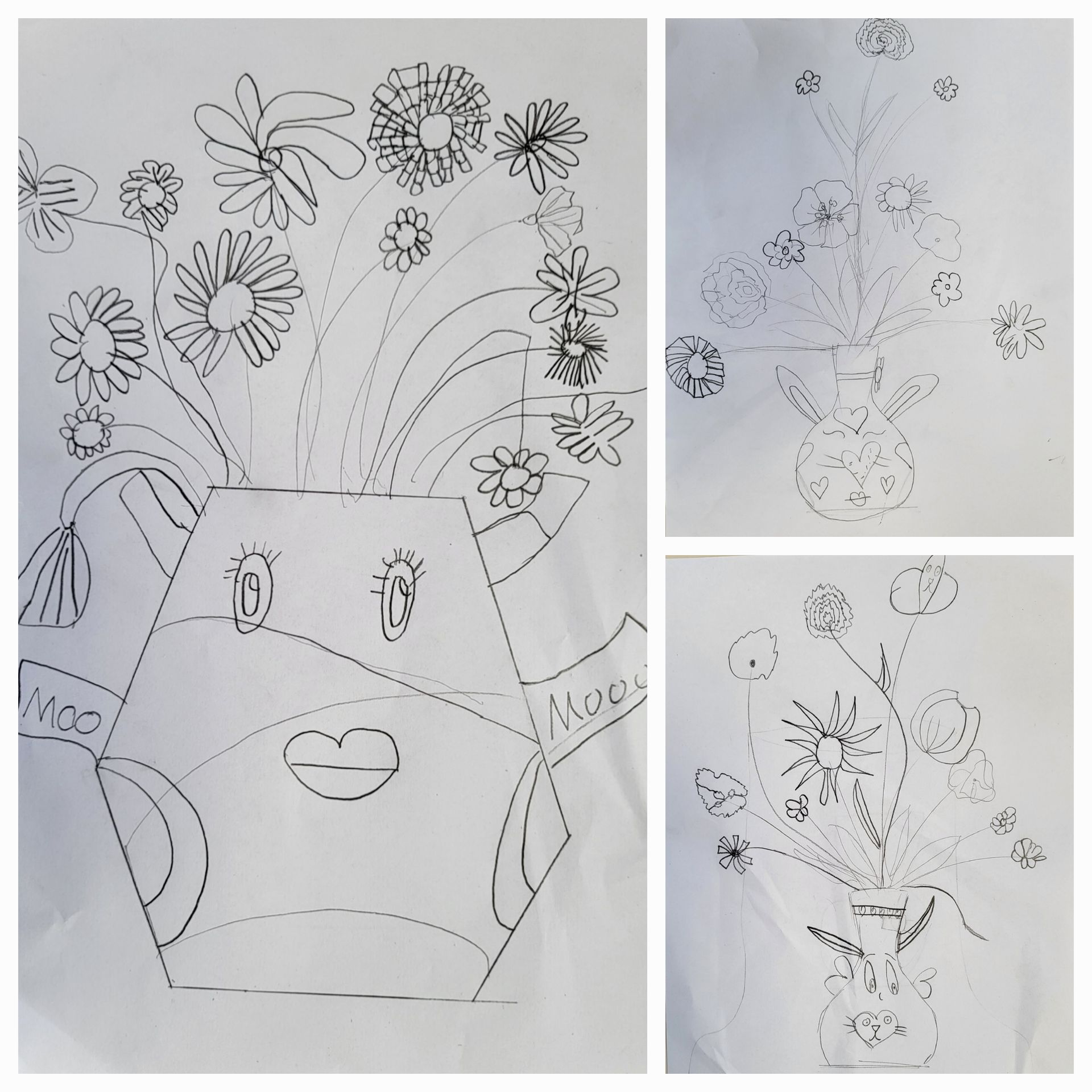 Je donne aux enfants des conseils, un modèle de base, quelques propositions de dessins de vase. Je leur recommande la liberté et l'imagination. Leur créativité s'exprime de plein de manières.... Ils apprécient aussi les bouquets de fleurs fraiche pour les observer "en vrai".
