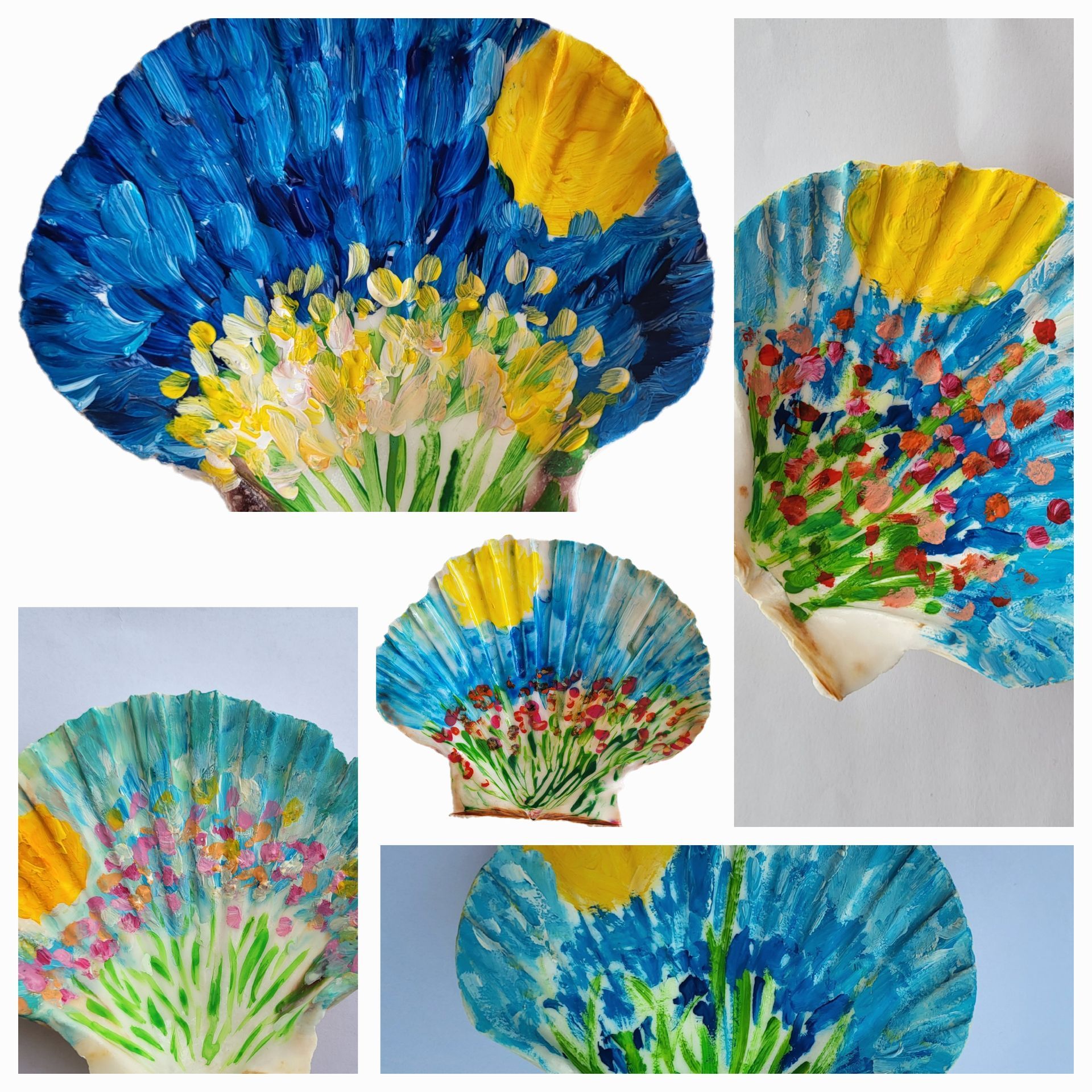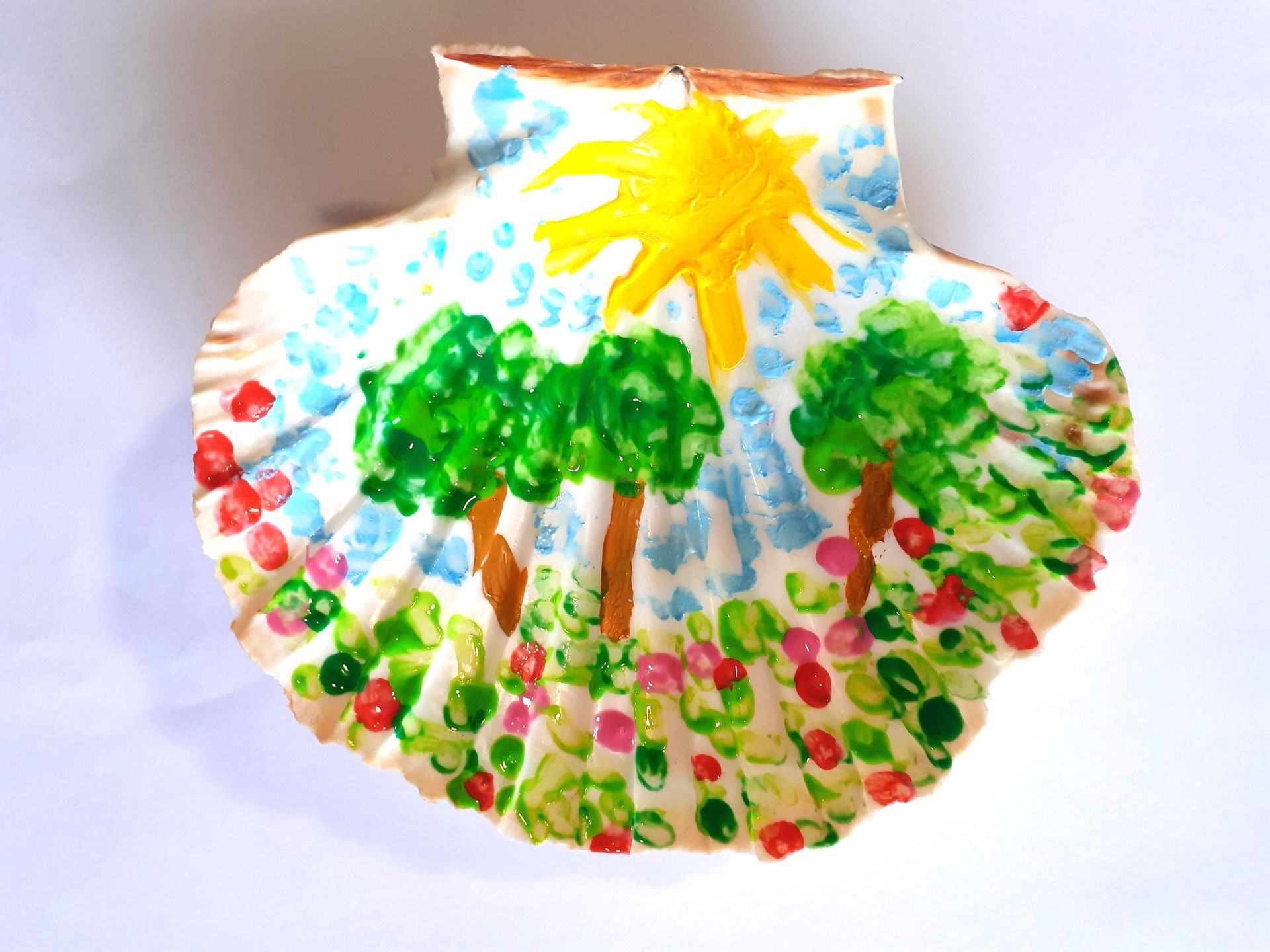 2 coquilles Saint-Jacques, une creuse et une plate, accompagnées de nombreuses fiches inspirantes pour stimuler la créativité, sont proposées aux enfants, ainsi que de la gouache, des cotons tiges, des pinceaux, ainsi que des feuilles A4 (primaires) et A5 (maternelles) pour continuer à peindre sur un autre support.