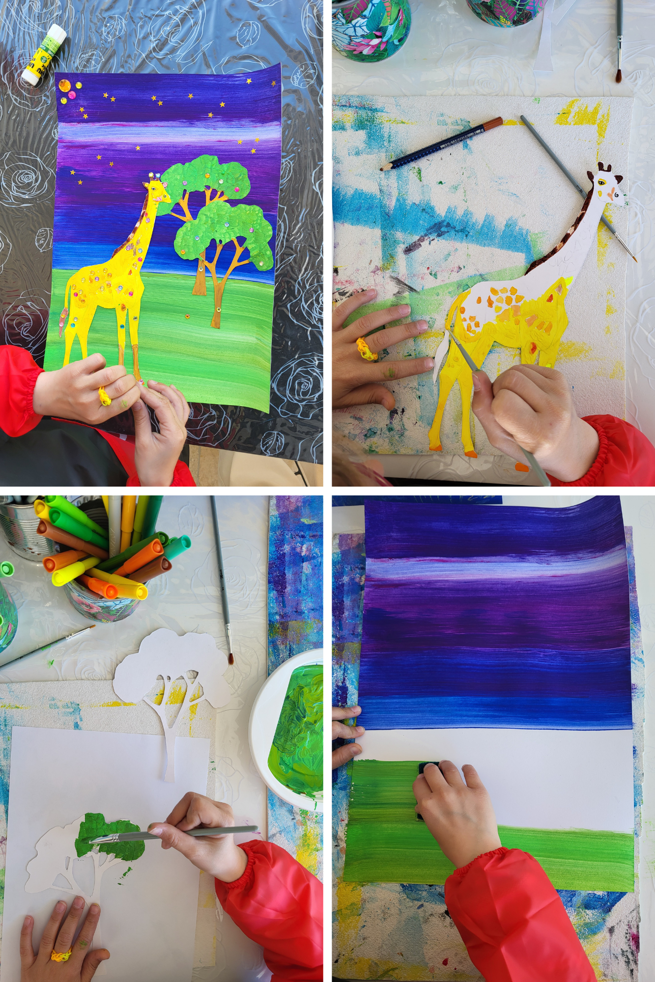 Posters couleur 50*60 ou 50*65 cm ou feuilles A4 (ou A3) pour une version individuelle, différents matériaux (strass, sequins, gel pailleté, etc), crayons de couleur et feutres, pastels à l'huile, colle - gouache pour les versions individuelles.