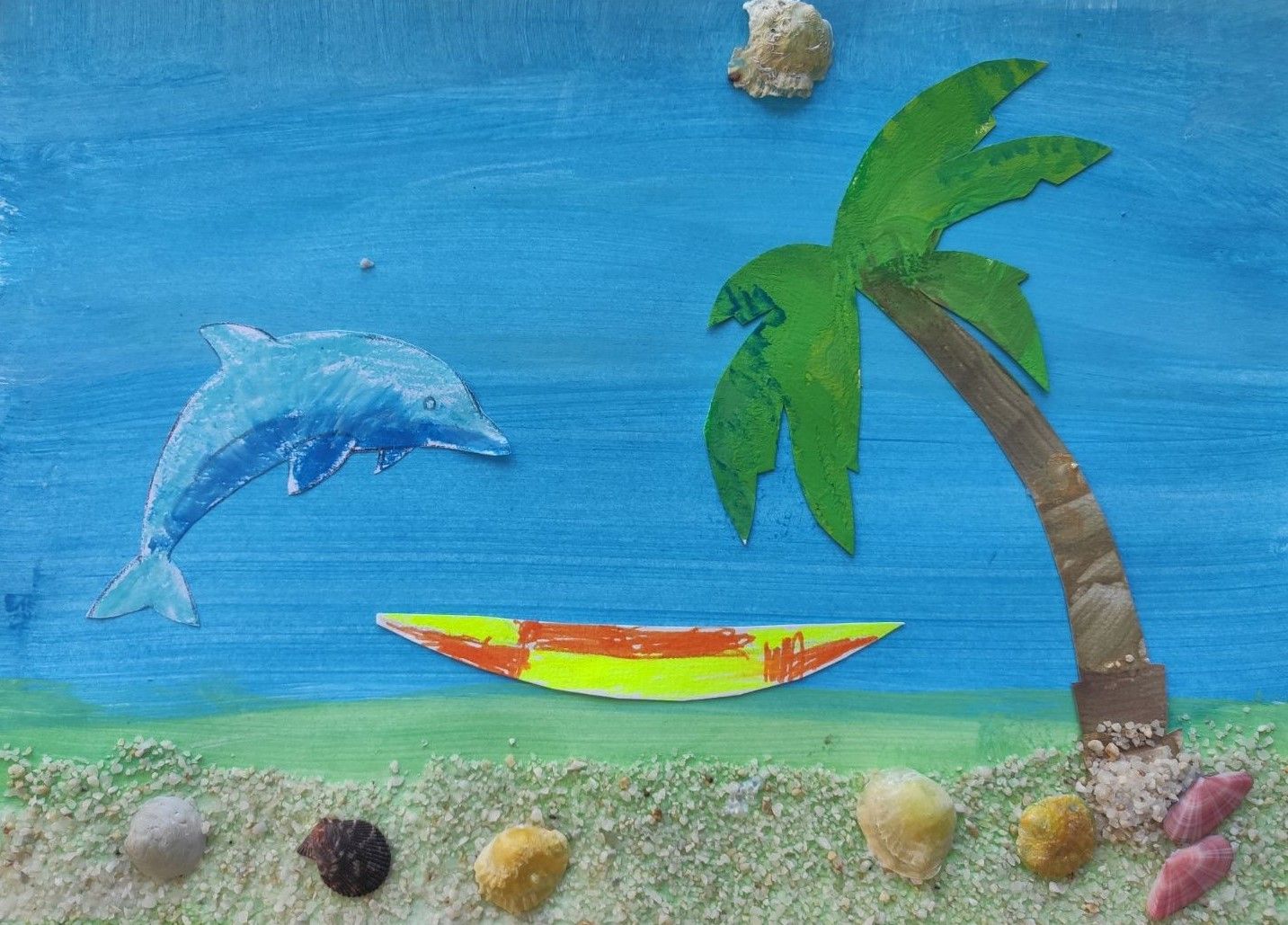 Peindre le ciel et la mer à l’éponge, les palmes au doigt ou au pinceau, colorier la pirogue et le dauphin avec des crayons, des pastels ou des feutres, et enfin coller du sable et des coquillages. Chaque enfant dispose d'un plateau pour ne pas disperser les petits éléments.