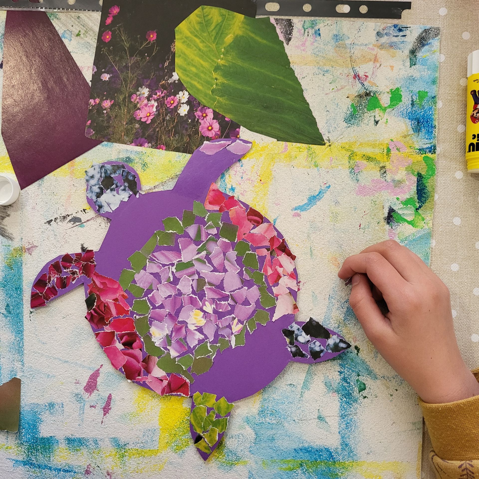 Deux formes animales (poisson ou tortue) découpées dans du papier de différentes couleurs, sont proposées aux enfants avec une sélection de feuilles de magazine dans différentes harmonies et de la colle adaptée.